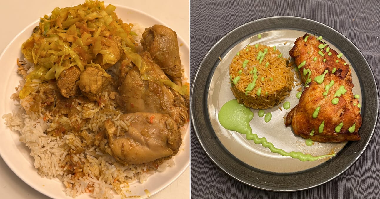 Chicken Curry & Rice (left) and Chicken with Rice & Cilantro-Jalapeno Chutney (right).