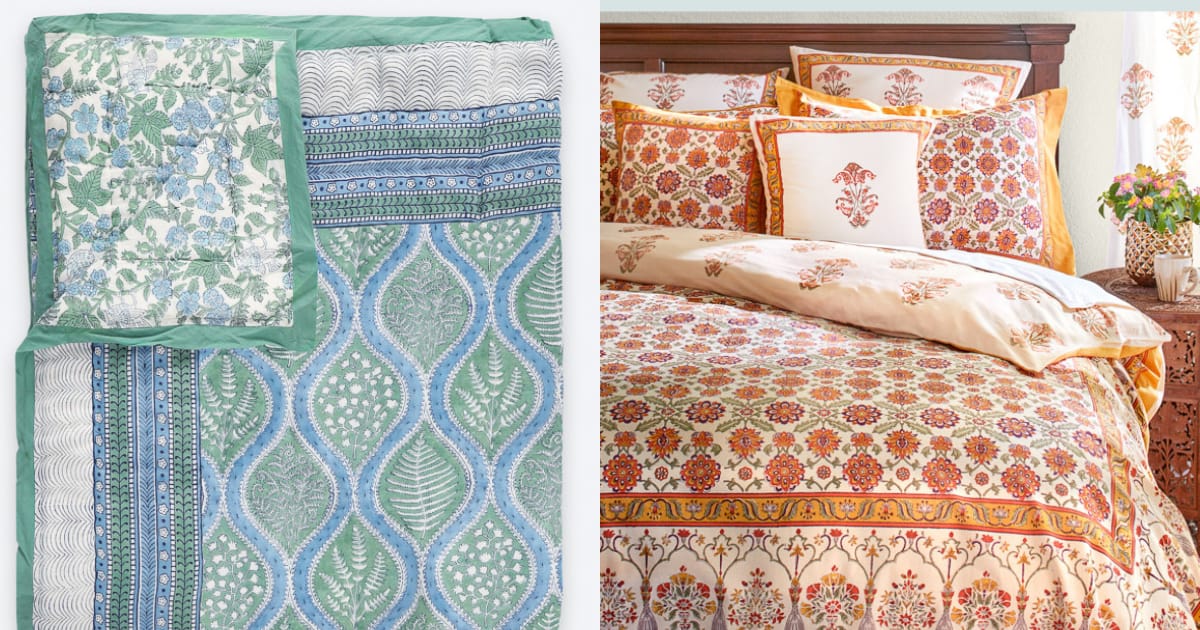Saffron Marigold offerings include bedding, curtains, and table linens and are characterized by their rich, saturated colors and intricate patterns inspired by world cultures, Indian gardens, and royal architecture. Their cotton quilts are among their best-selling products and are often-reversible so you get two looks in one.